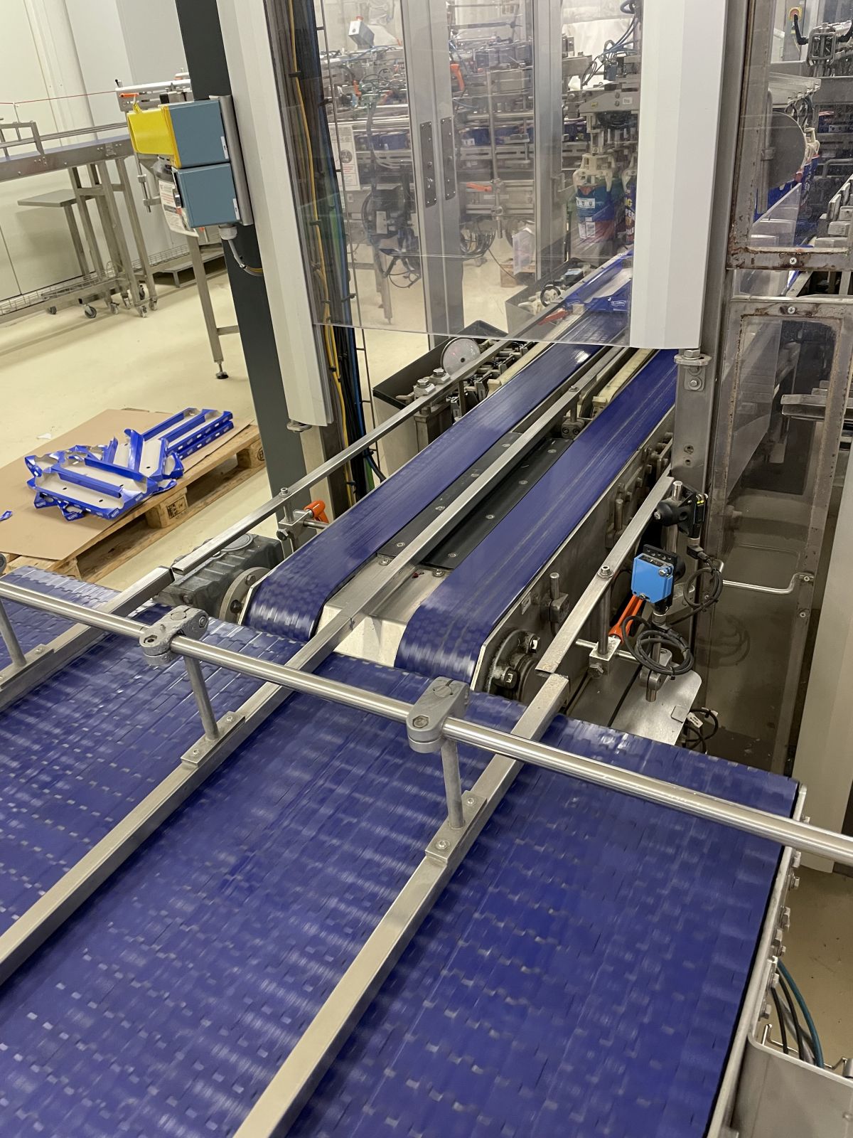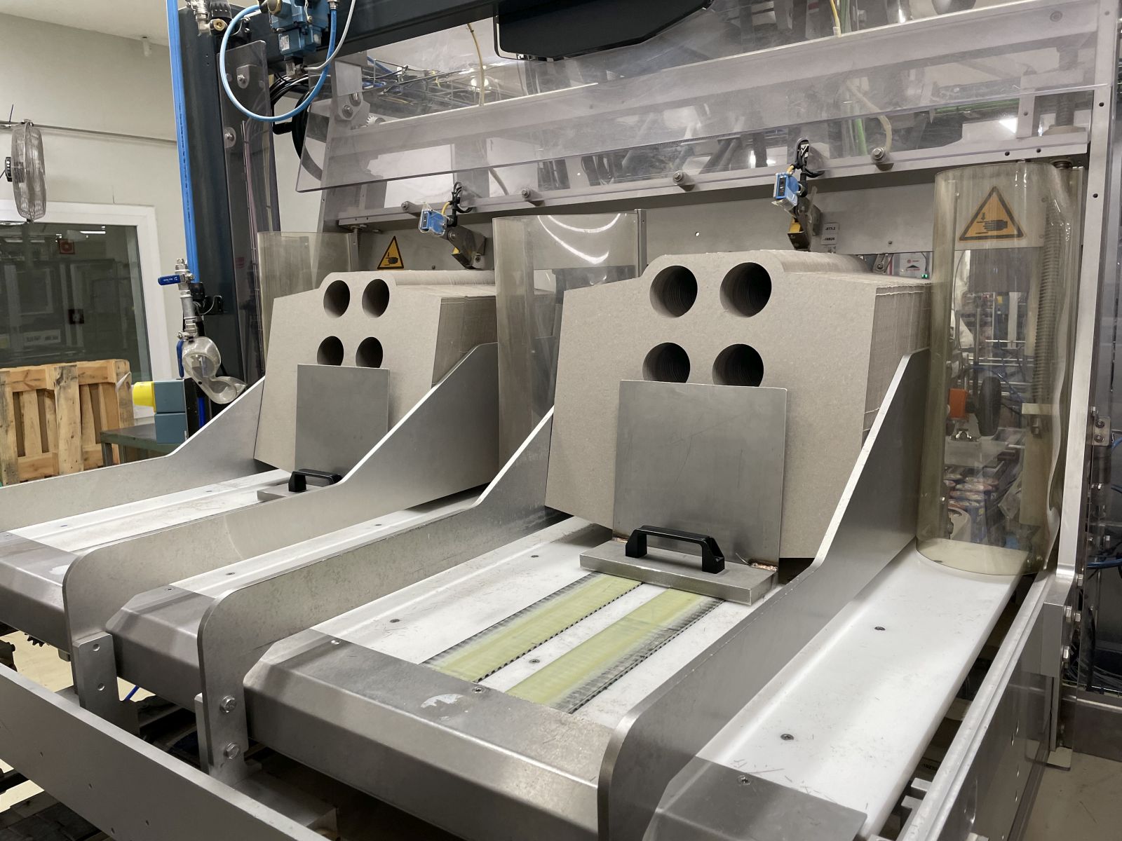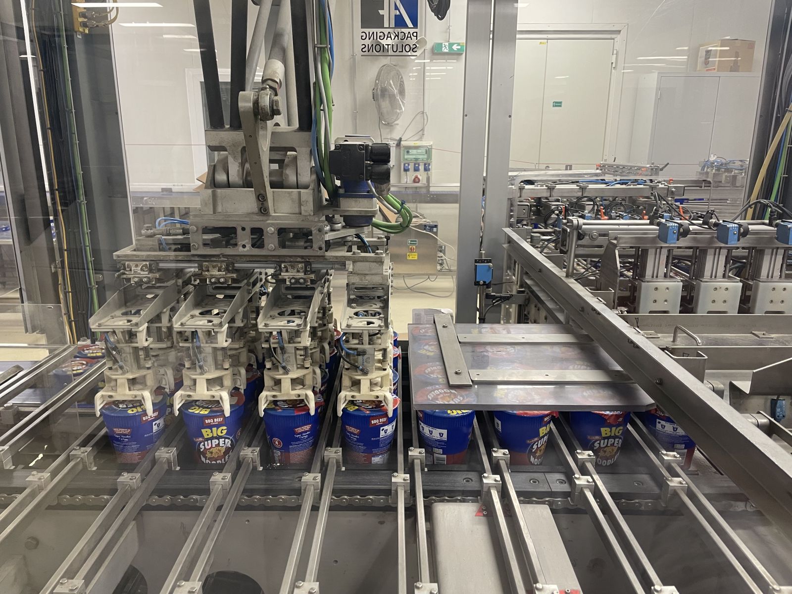 Leírás: Csomagoló gépsor poharas vagy dobozos termékek kartonba való gyűjtő csomagolásához