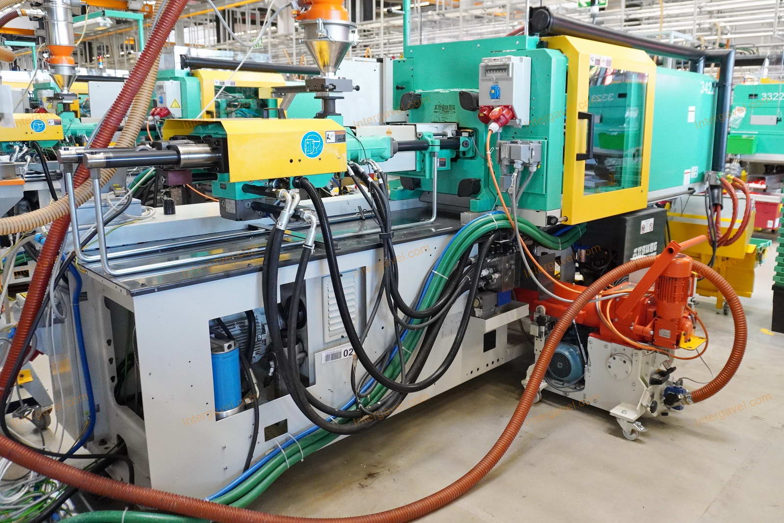 - gép környezetében látható egyéb eszközök nem tartoznak a tételhez, mint pl szállító szalag, műanyag daráló, láda cserélő, temperáló, granulátum keverő és csővezetéke, tároló eszközök stb.