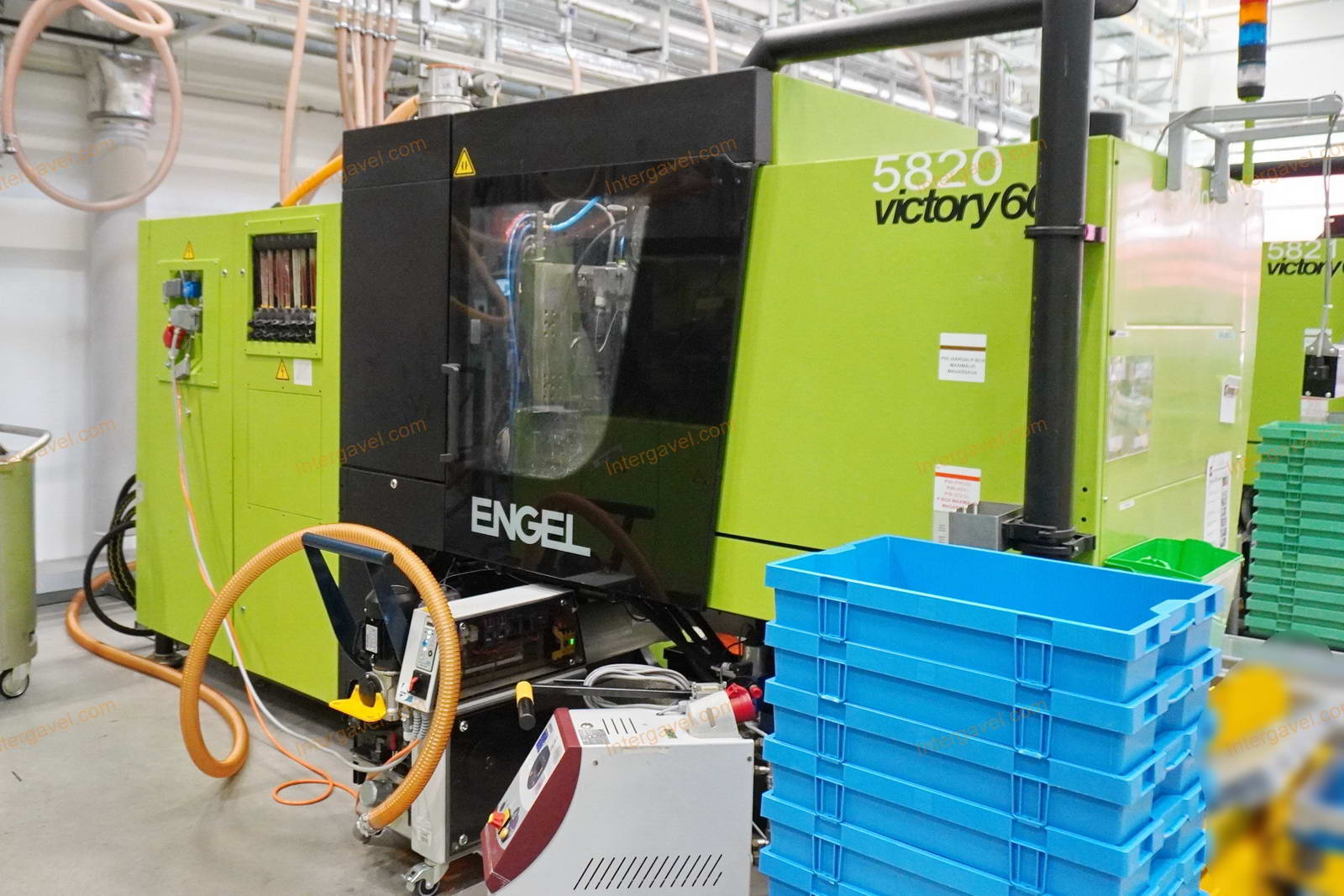 - gép környezetében látható egyéb eszközök nem tartoznak a tételhez, mint pl szállító szalag, műanyag daráló, láda cserélő, temperáló, granulátum keverő és csővezetéke, tároló eszközök stb.