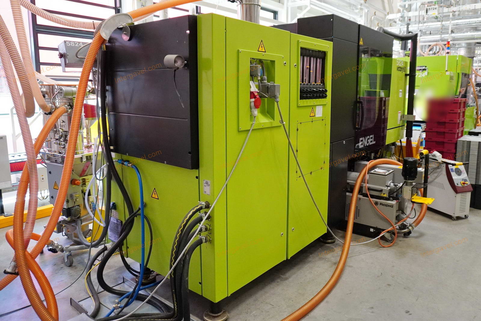 - gép környezetében látható egyéb eszközök nem tartoznak a tételhez, mint pl szállító szalag, műanyag daráló, láda cserélő, temperáló, granulátum keverő és csővezetéke, tároló eszközök stb.
