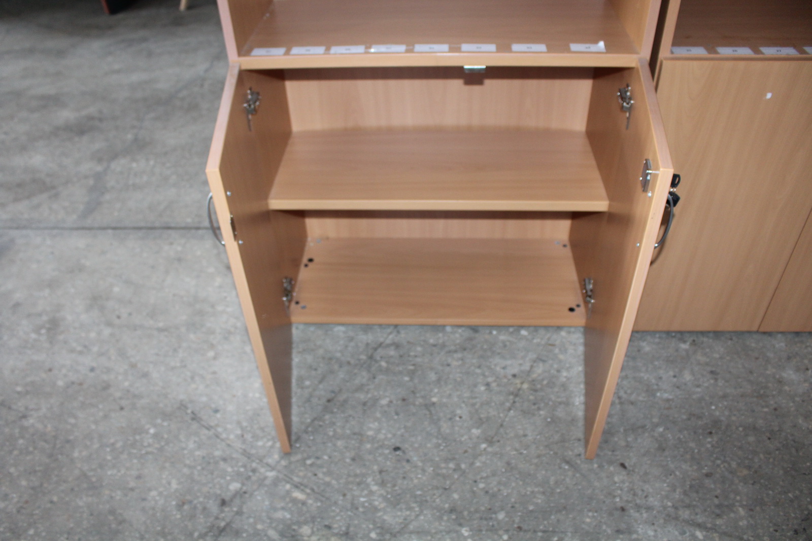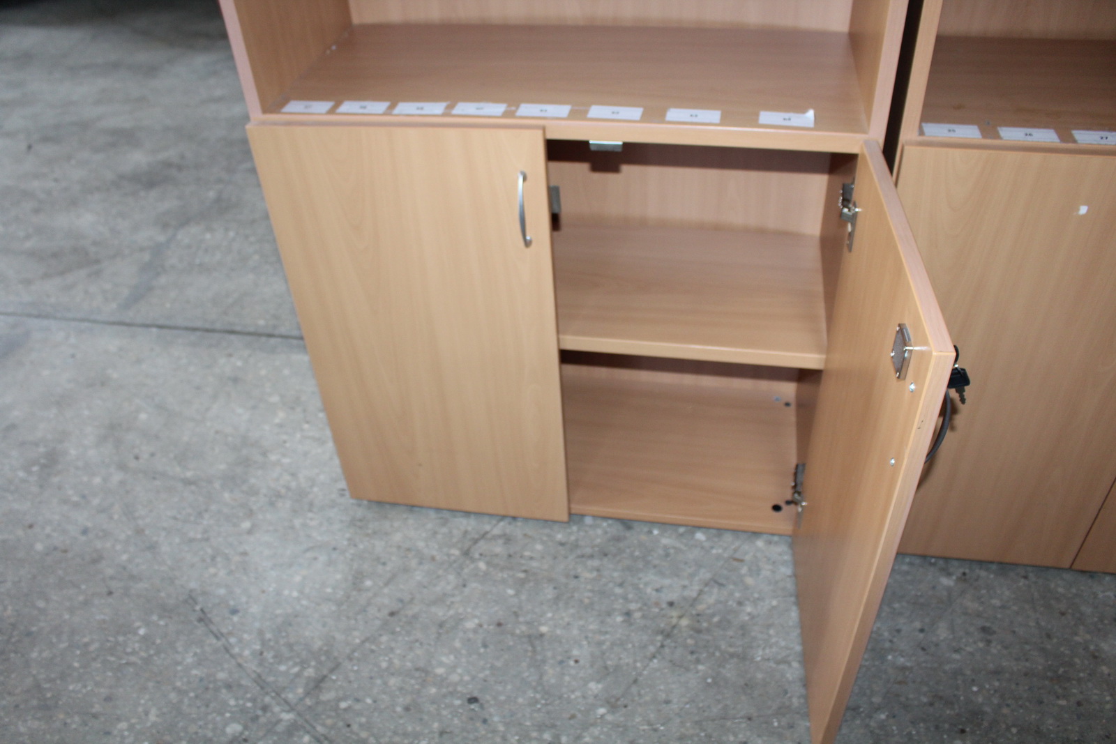 Egyik szekrény alsó részen zárt, kulcs nincs a zárhoz.