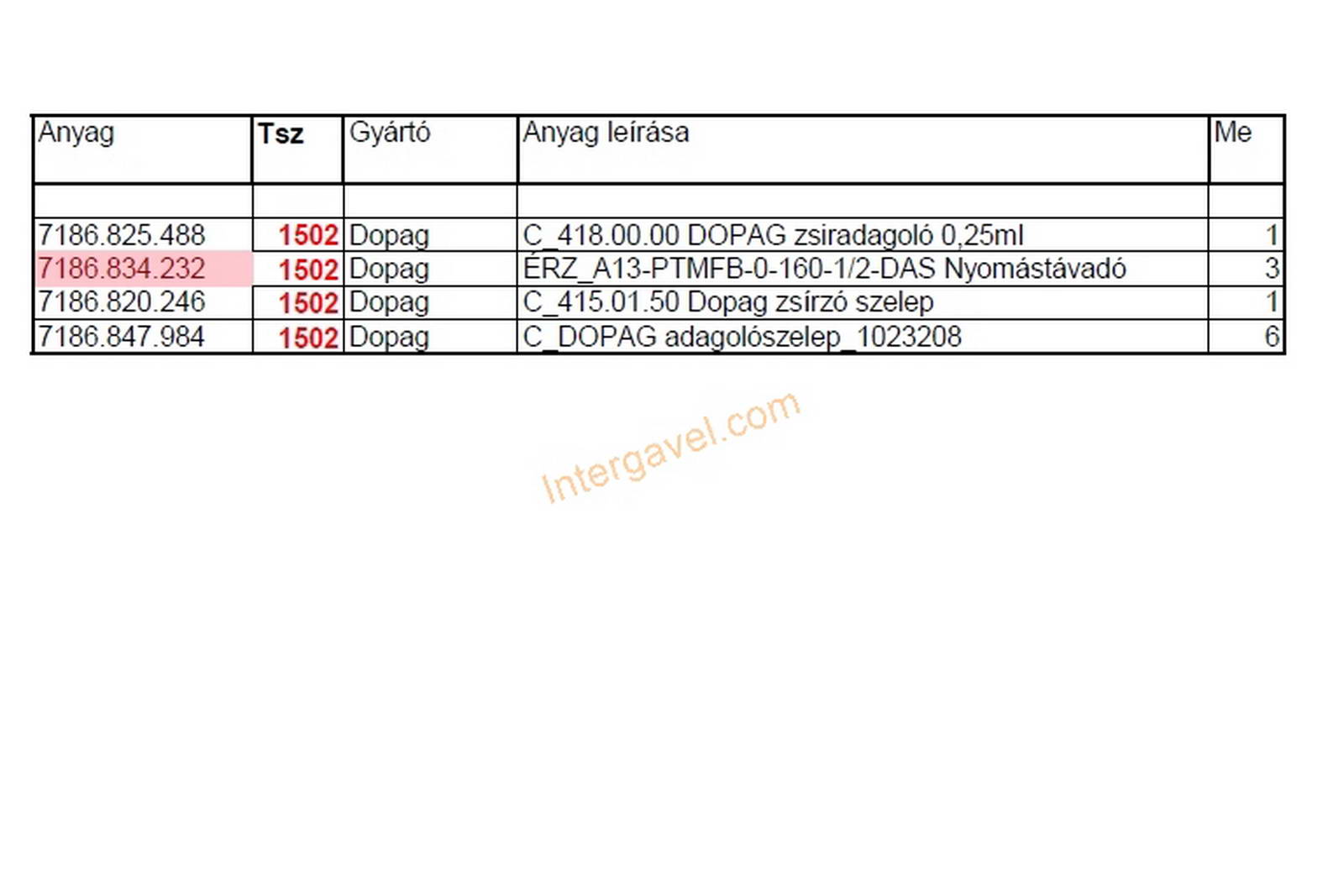 - tétel jellemzően Dopag alkatrészeket tartalmaz