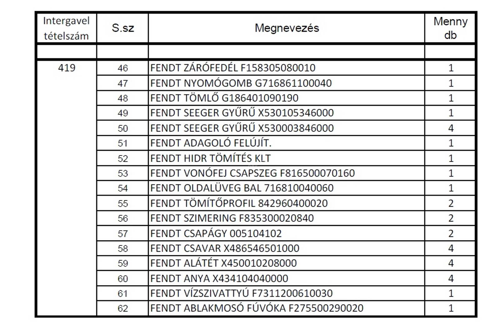 - tétel Fendt alkatrészeket tartalmaz