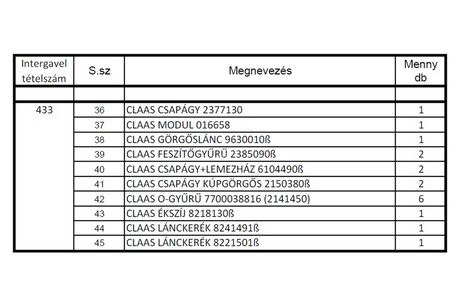 - tétel Claas alkatrészeket tartalmaz