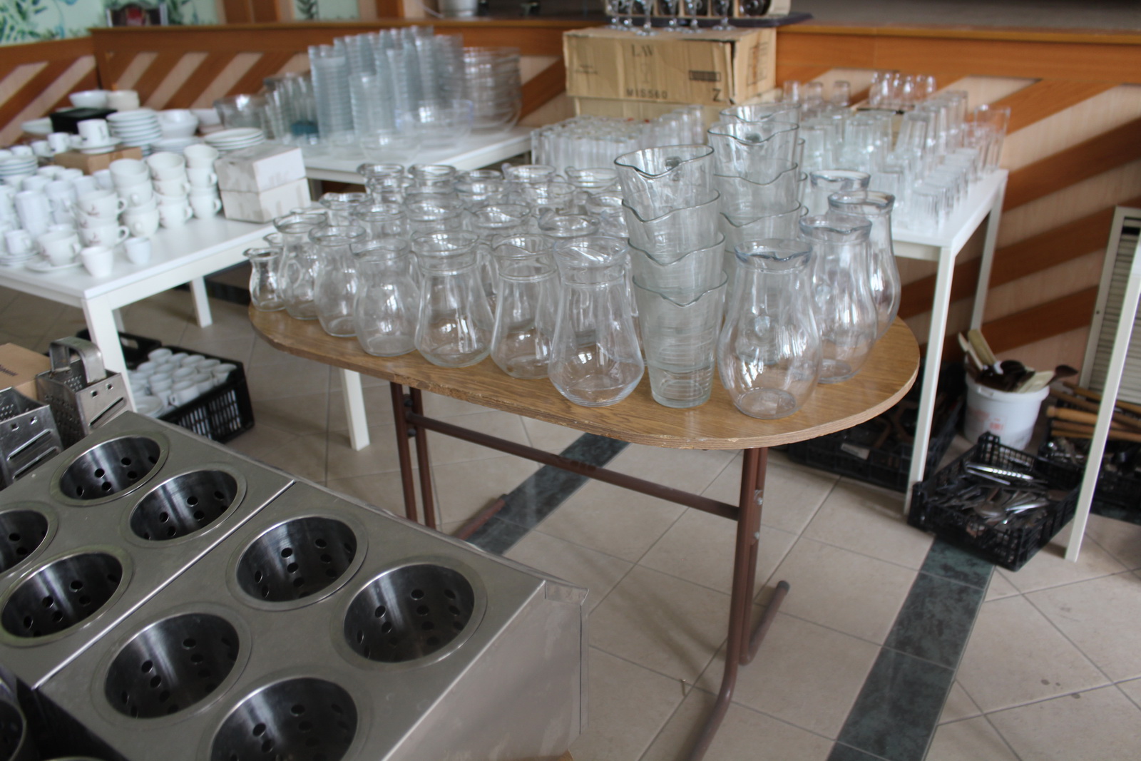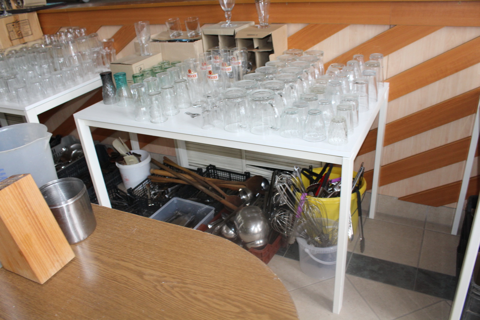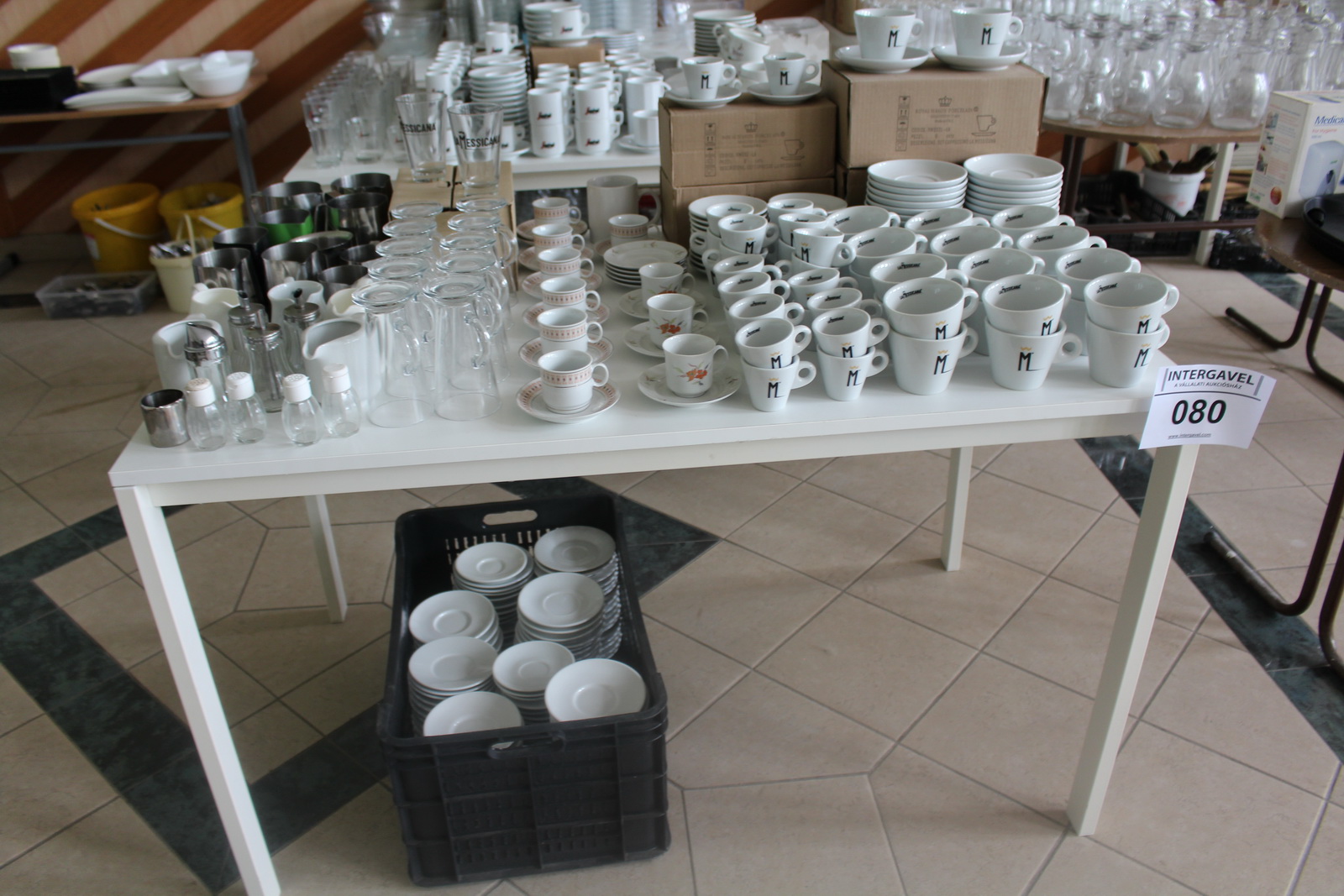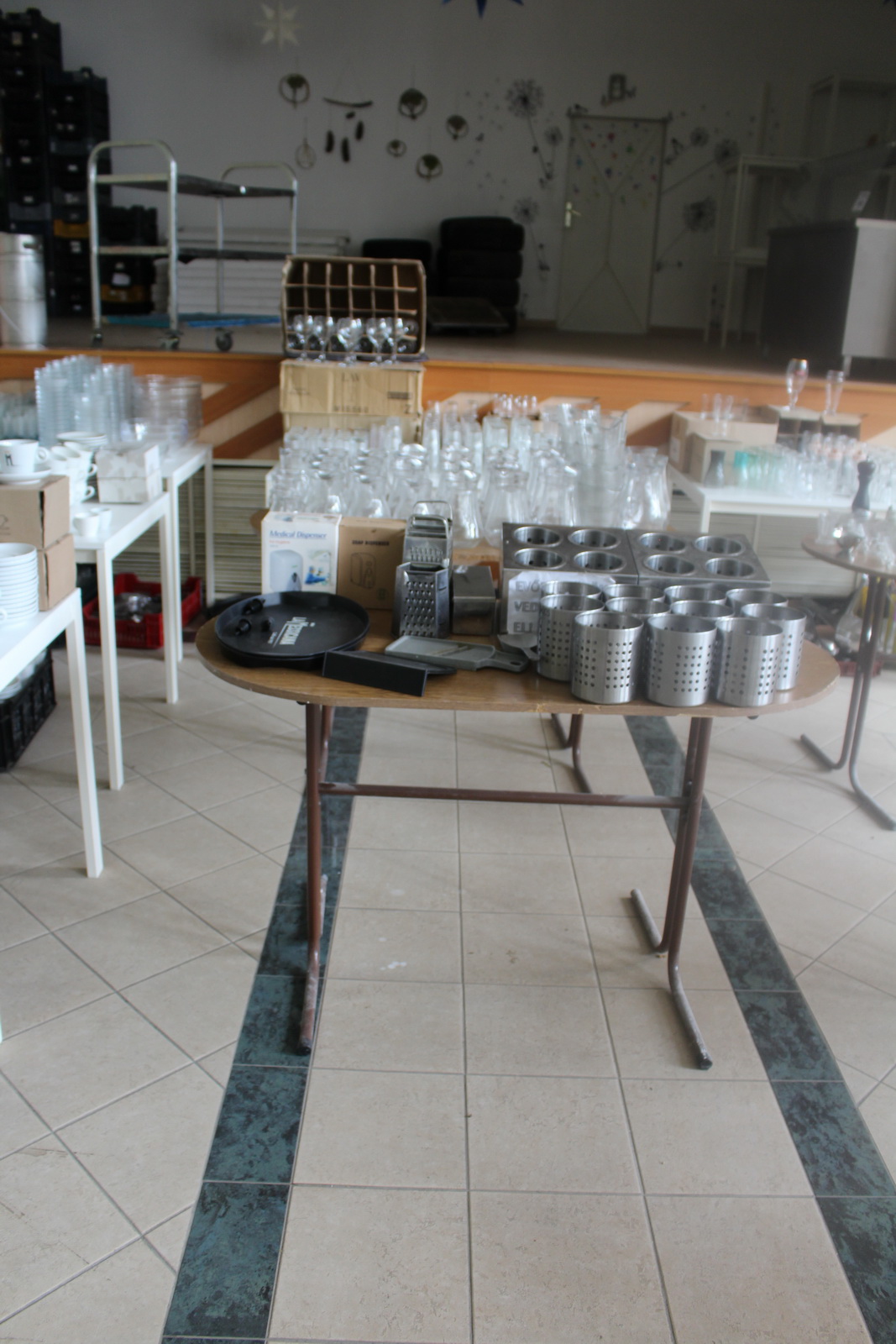 Tétel tartalma a képeken látható vegyes tányérok, poharak, csészék, evőeszközök és egyéb konyhai eszközök.