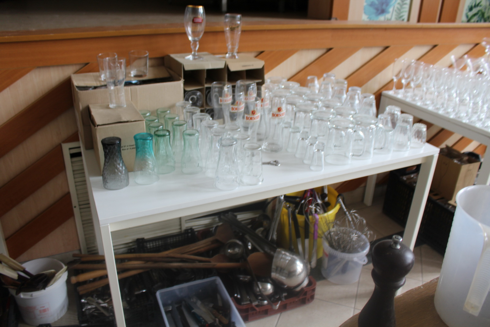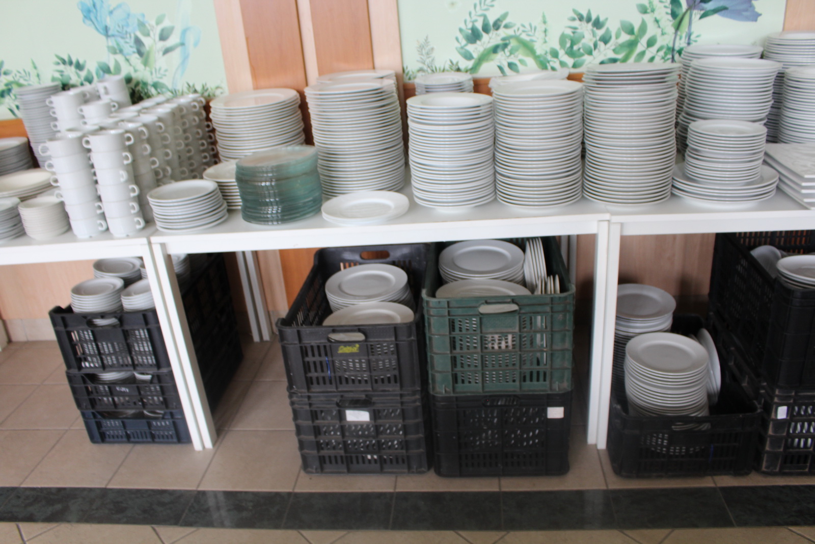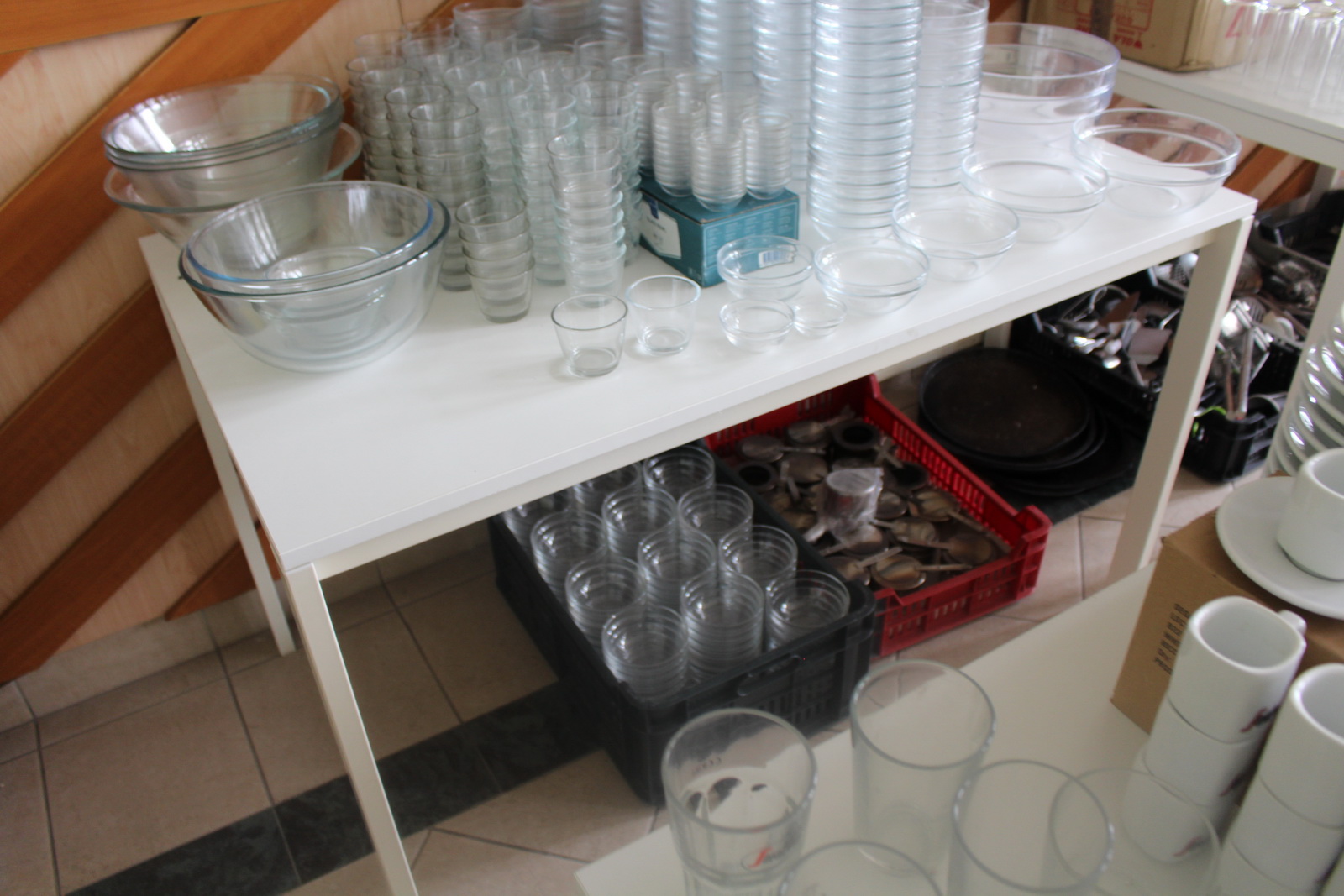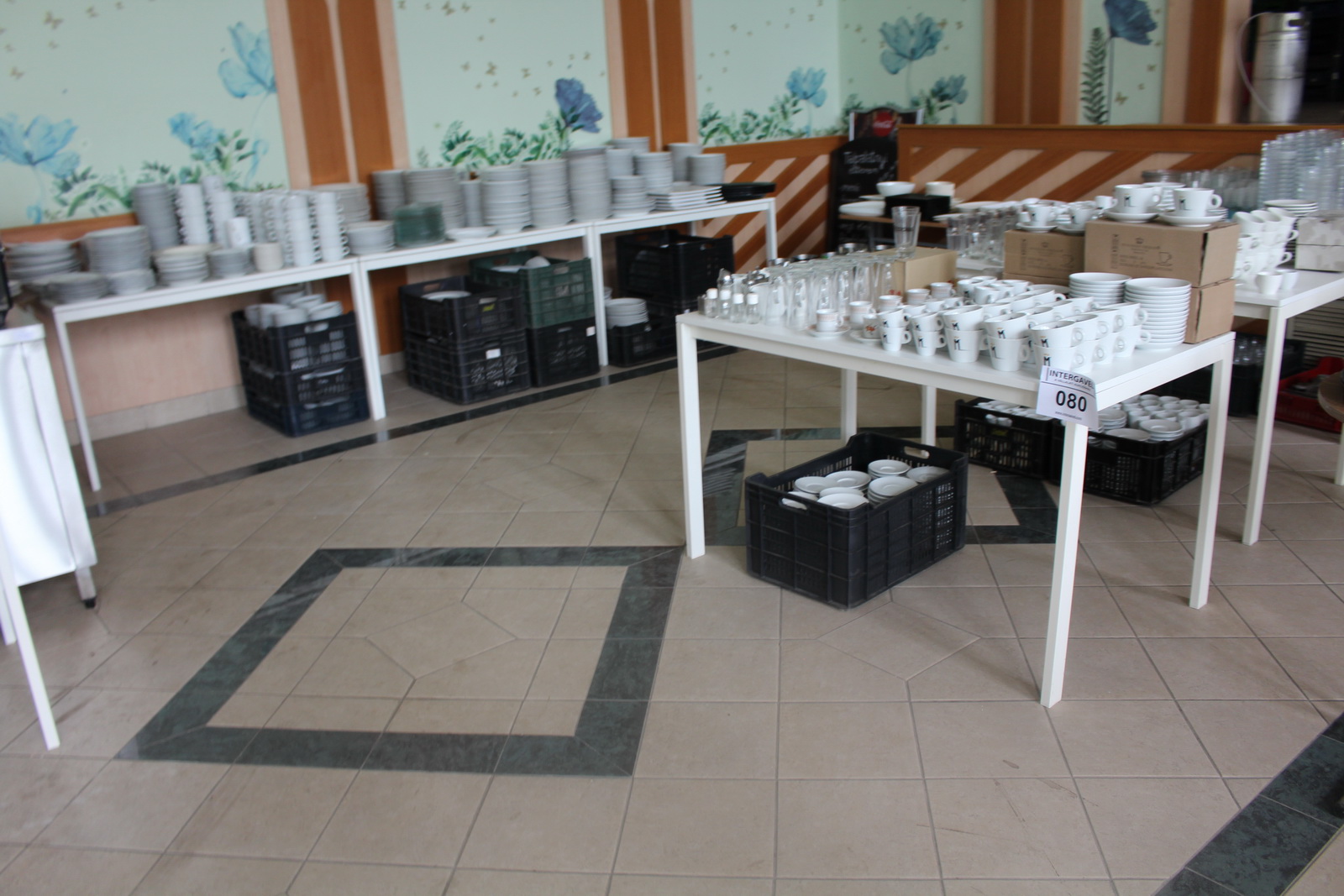 Tétel tartalma a képeken látható vegyes tányérok, poharak, csészék, evőeszközök és egyéb konyhai eszközök.