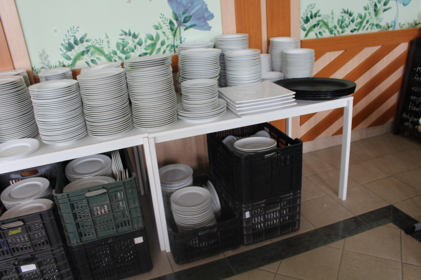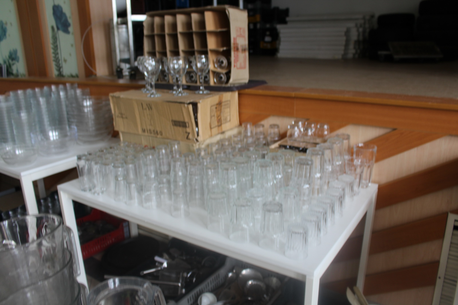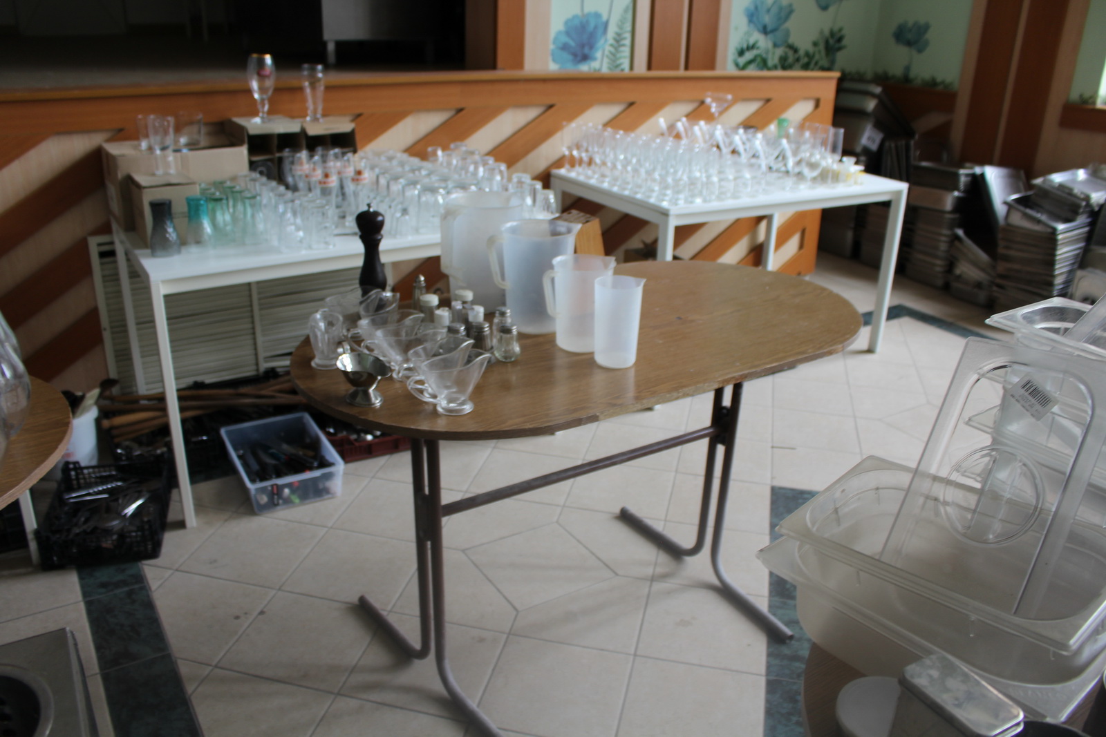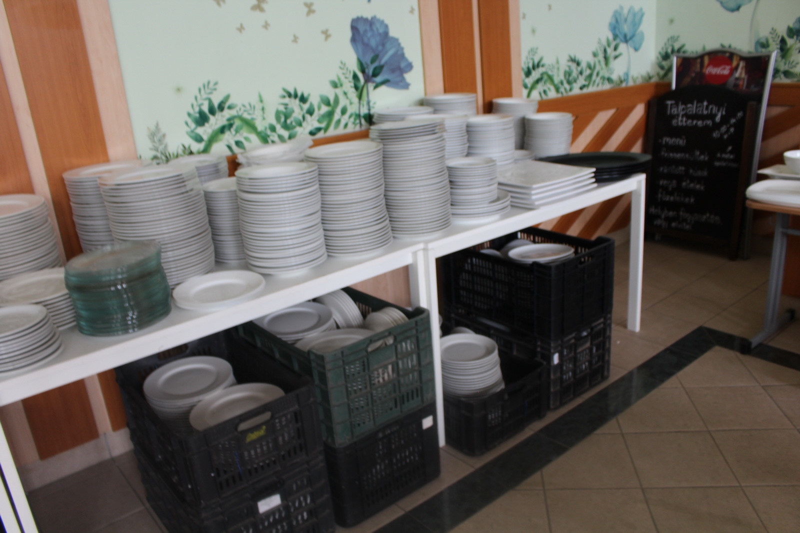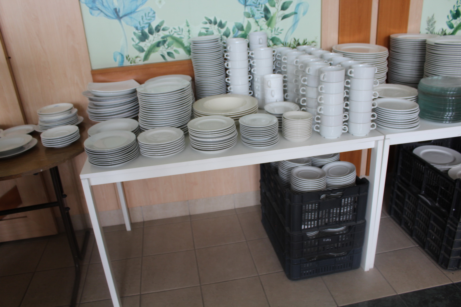Tétel tartalma a képeken látható vegyes tányérok, poharak, csészék, evőeszközök és egyéb konyhai eszközök.