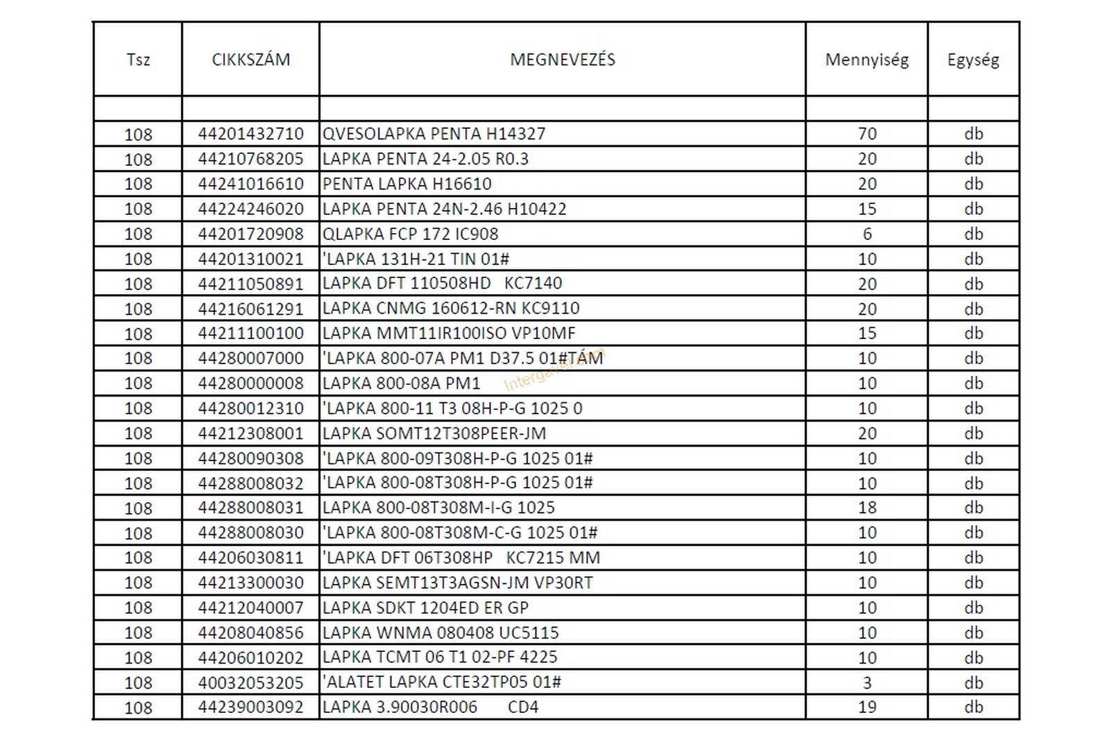 - eladó nyilvántartása szerint a tétel tartalmának felsorolása a második képen látható, ami kb. 95 %-os pontosságú